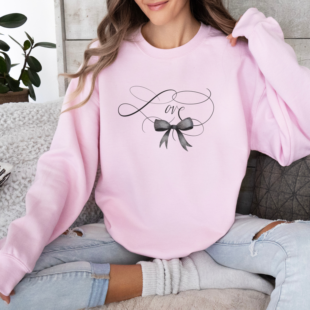 Looking for the perfect Valentine's Day crewneck? Enjoy our long sleeved sweatshirt with a hand calligraphy "love" design adorned with a coquette vintage retro styled bow. Adorable in many colors. This classic, unisex crewneck will fit like a well-loved favorite from its first wear. Our ultra soft Gildan crewnecks feature...