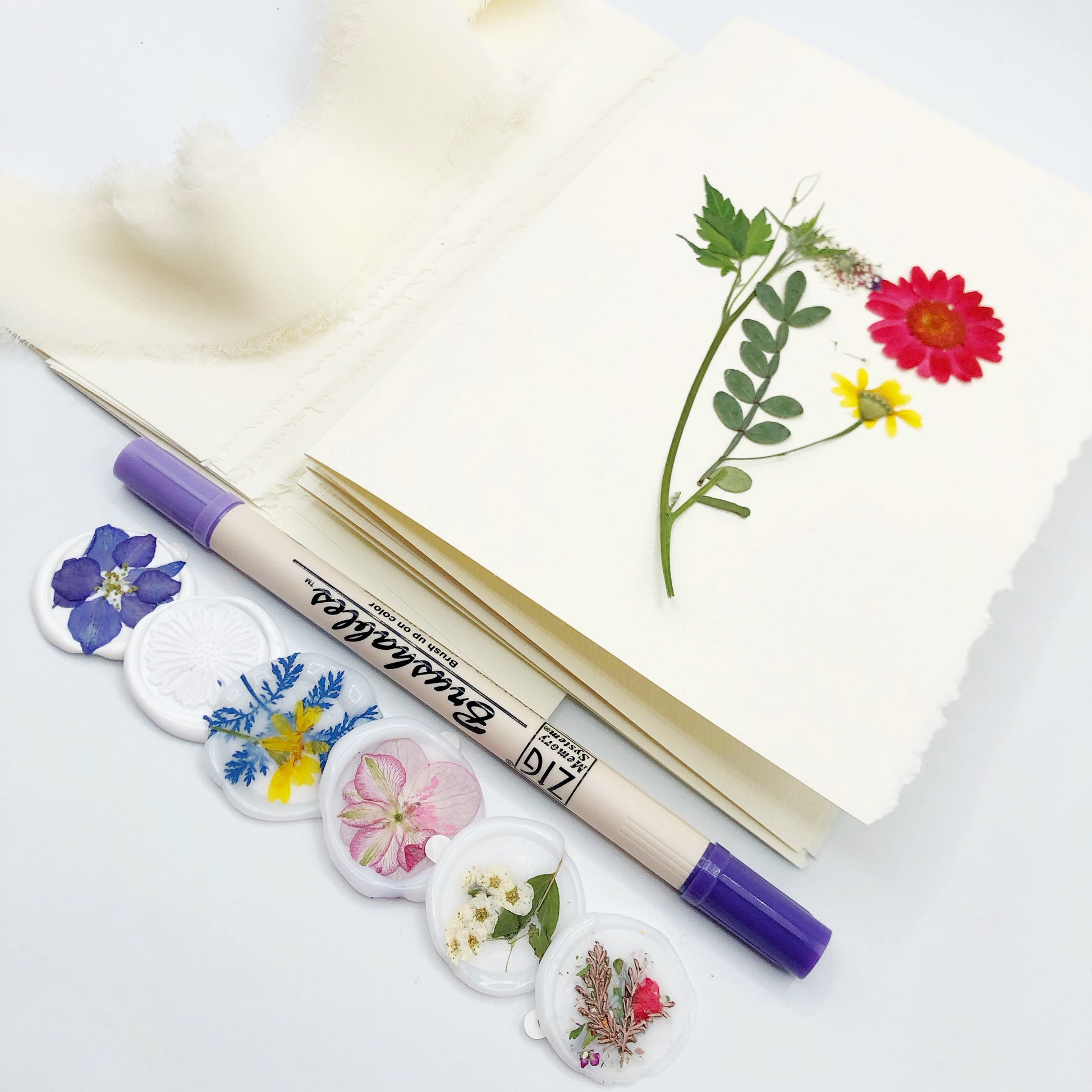 Calligraphy not included! Add your own calligraphy and hand lettering to create your own set of cards. Includes: 5 deckled edge envelopes, 5 ivory deckled edge cards, 3 pieces fringe chiffon silk ribbon (2 pieces long enough to tie around card seam and 1 for stand alone bow), 6 floral themed wax seals, assortment of loose pressed flowers, and a double sided Violet hue Zig brushables markers.