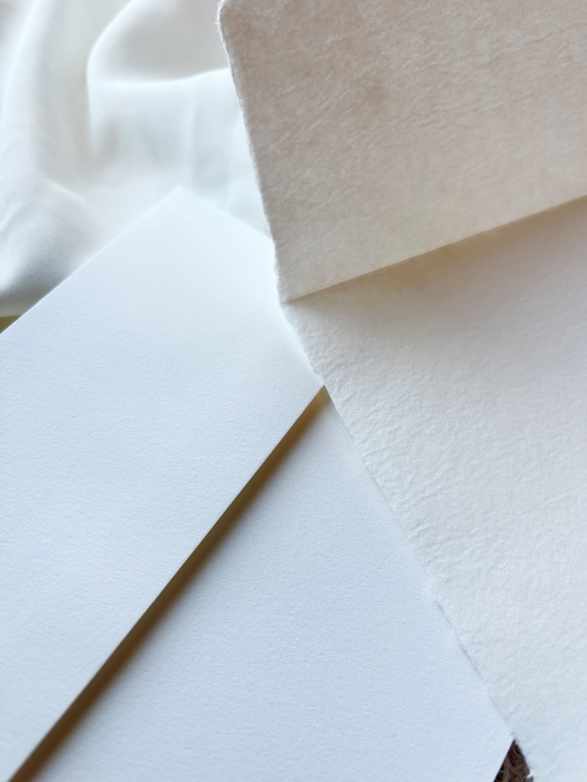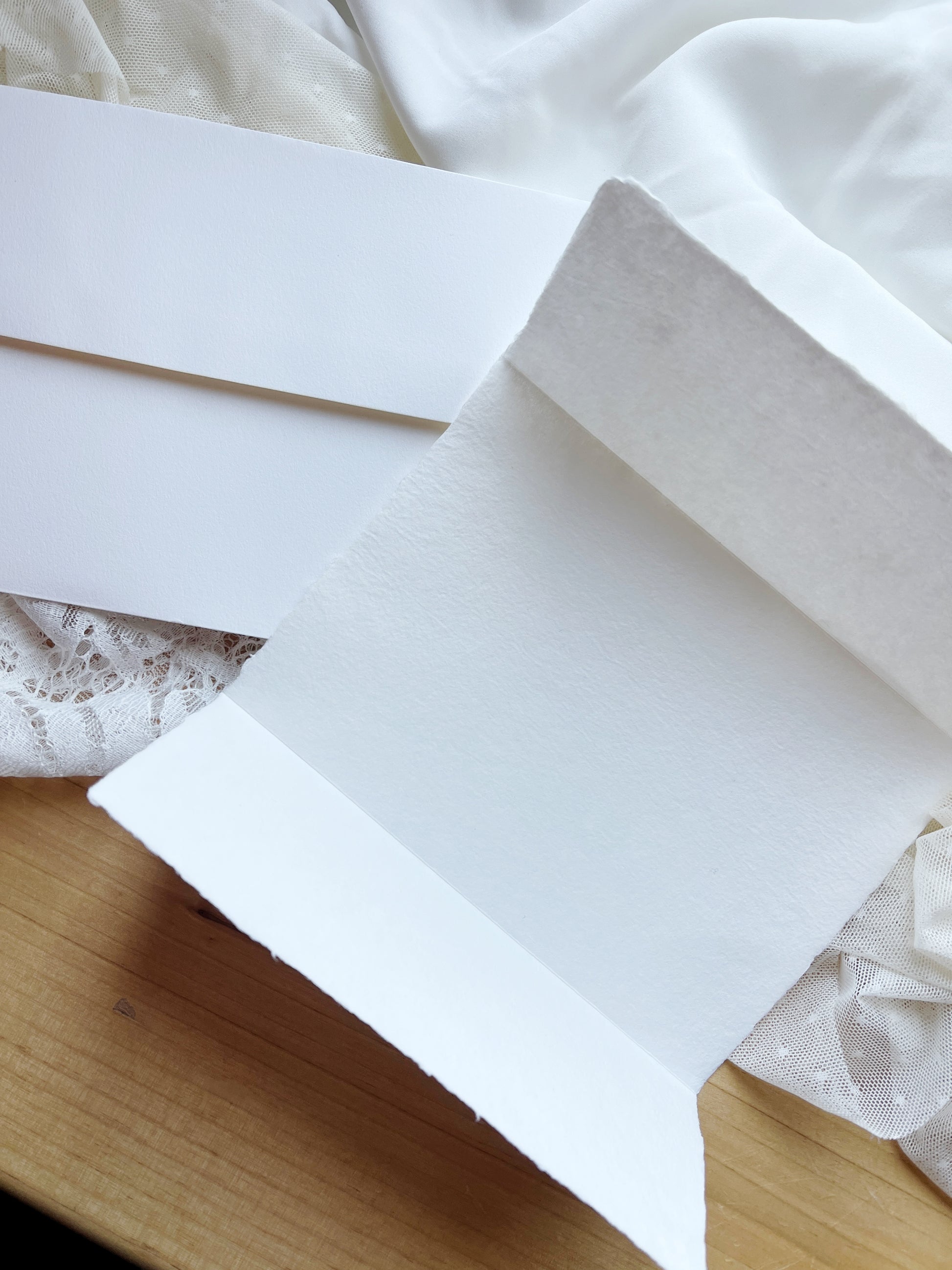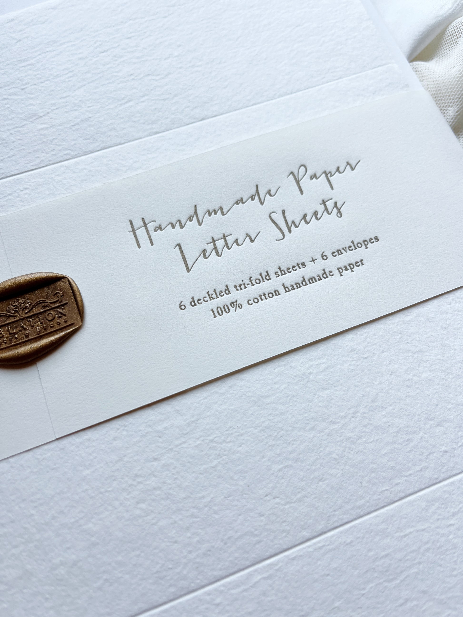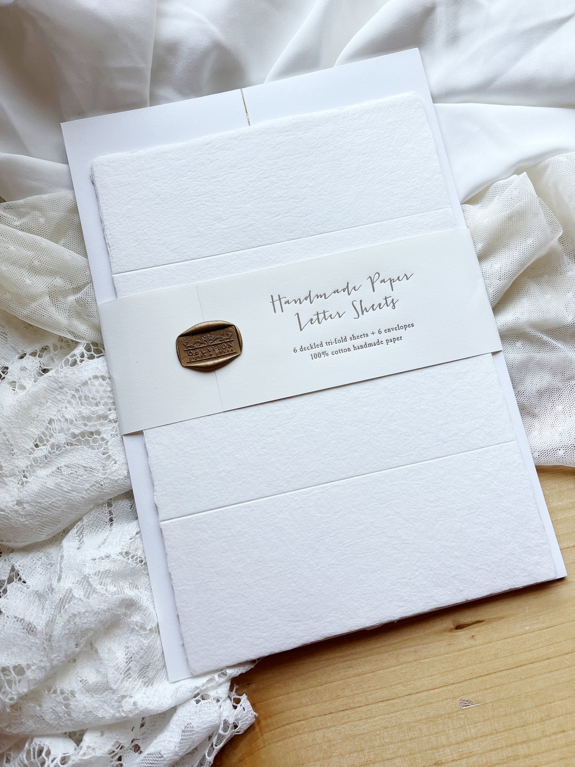 The handmade paper letter sheets make crafting keepsake letters simple. The handmade paper is made from 100% recycled cotton from the garment industry. - Romantic, timeless, pre-scored Regal (6.75 x 9.75 inch) sheets of 4-deckled handmade paper with matching A7 Envelopes.