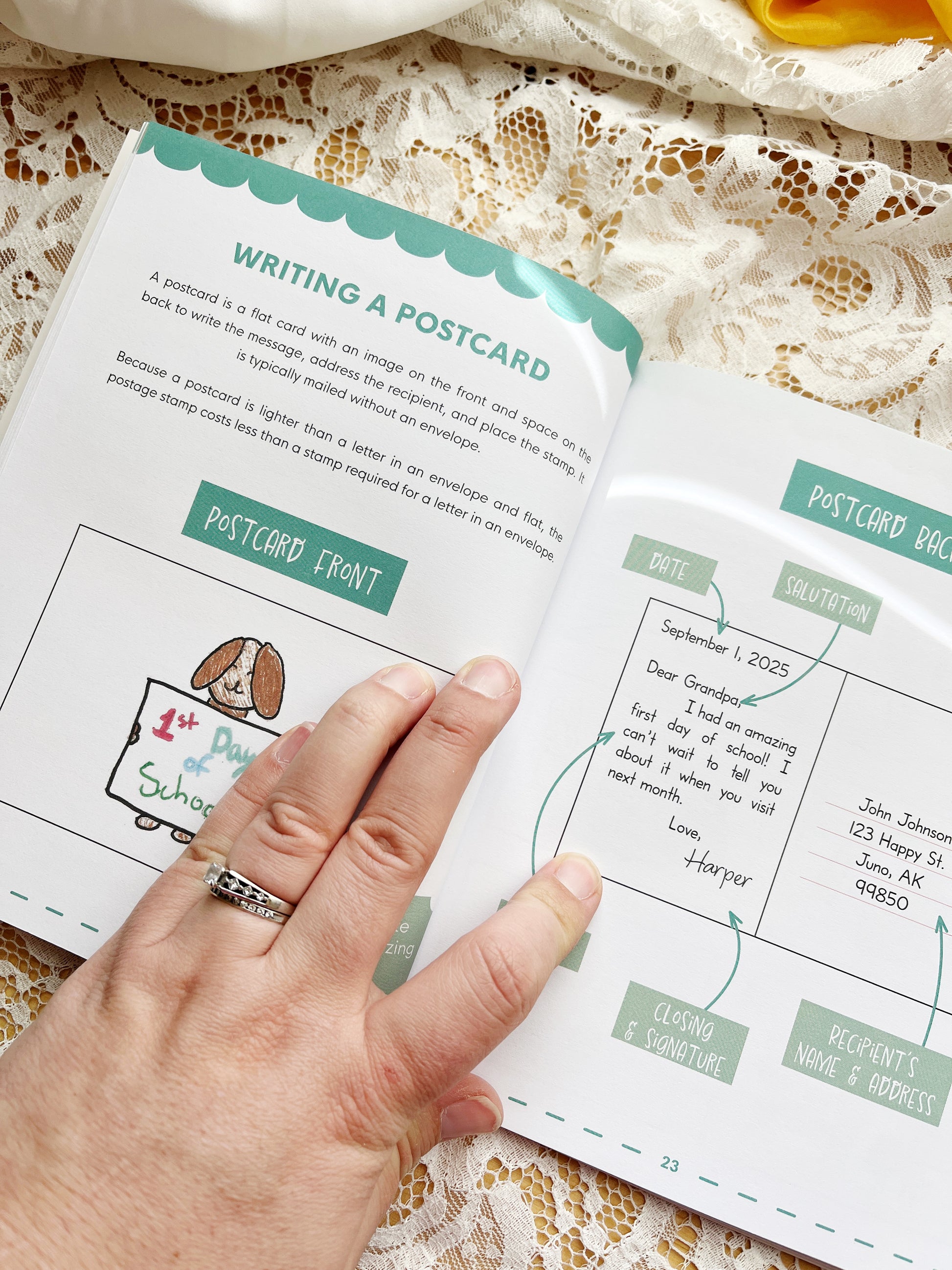 Pen Pals and Postcards: A Creative Workbook for Young Letter Writers is the perfect guide for children ages 5 and up to explore the art of written communication. This engaging workbook combines fun activities, practical skills, and creative expression to make letter writing an exciting adventure. What's Inside: Step-by-step guide to writing letters and addressing envelopes Tear-out stationery pages and postcards for immediate use Creative prompts for various occasions and seasons Address book and letter tracker to organize correspondence Charming illustrations to inspire young writers Key Features: Develops essential communication and social skills Encourages creativity and self-expression Teaches proper letter structure and etiquette Flexible approach adapts to your child's pace and interests Ideal for both classroom and homeschool learning environments