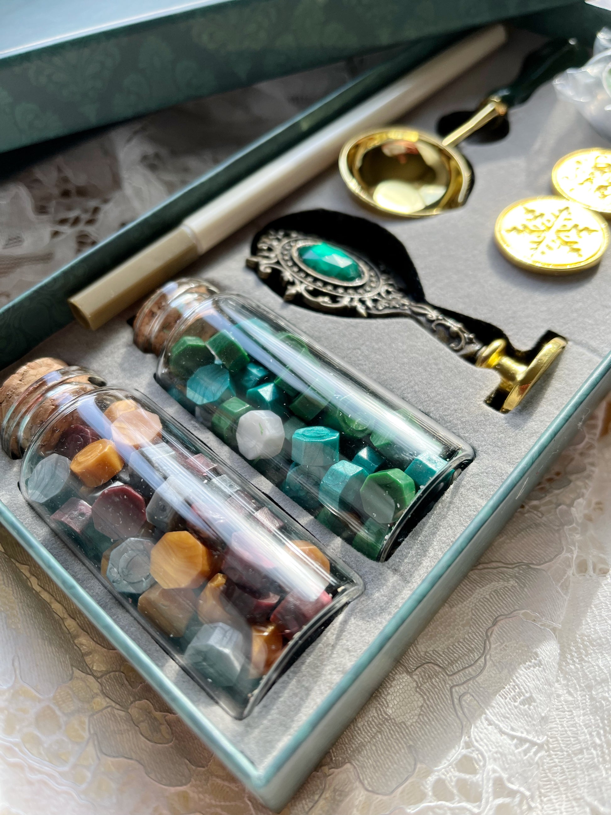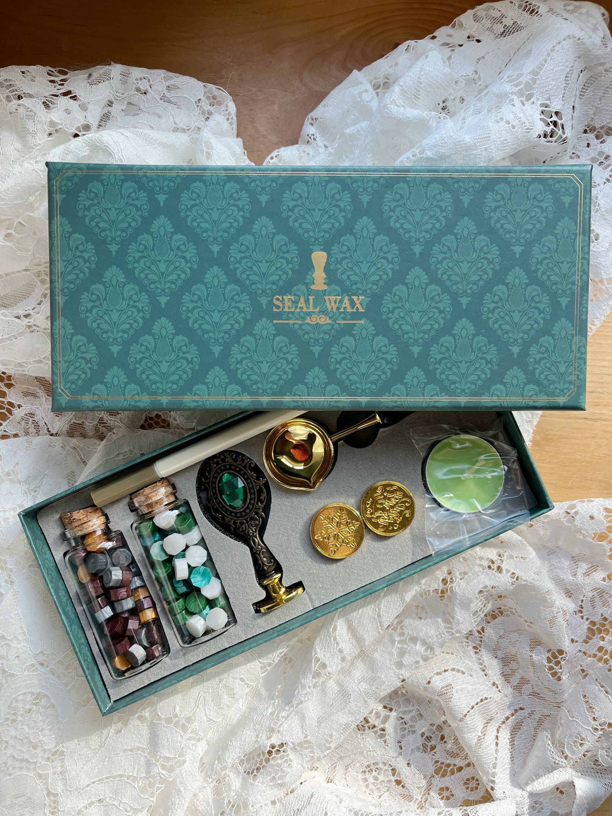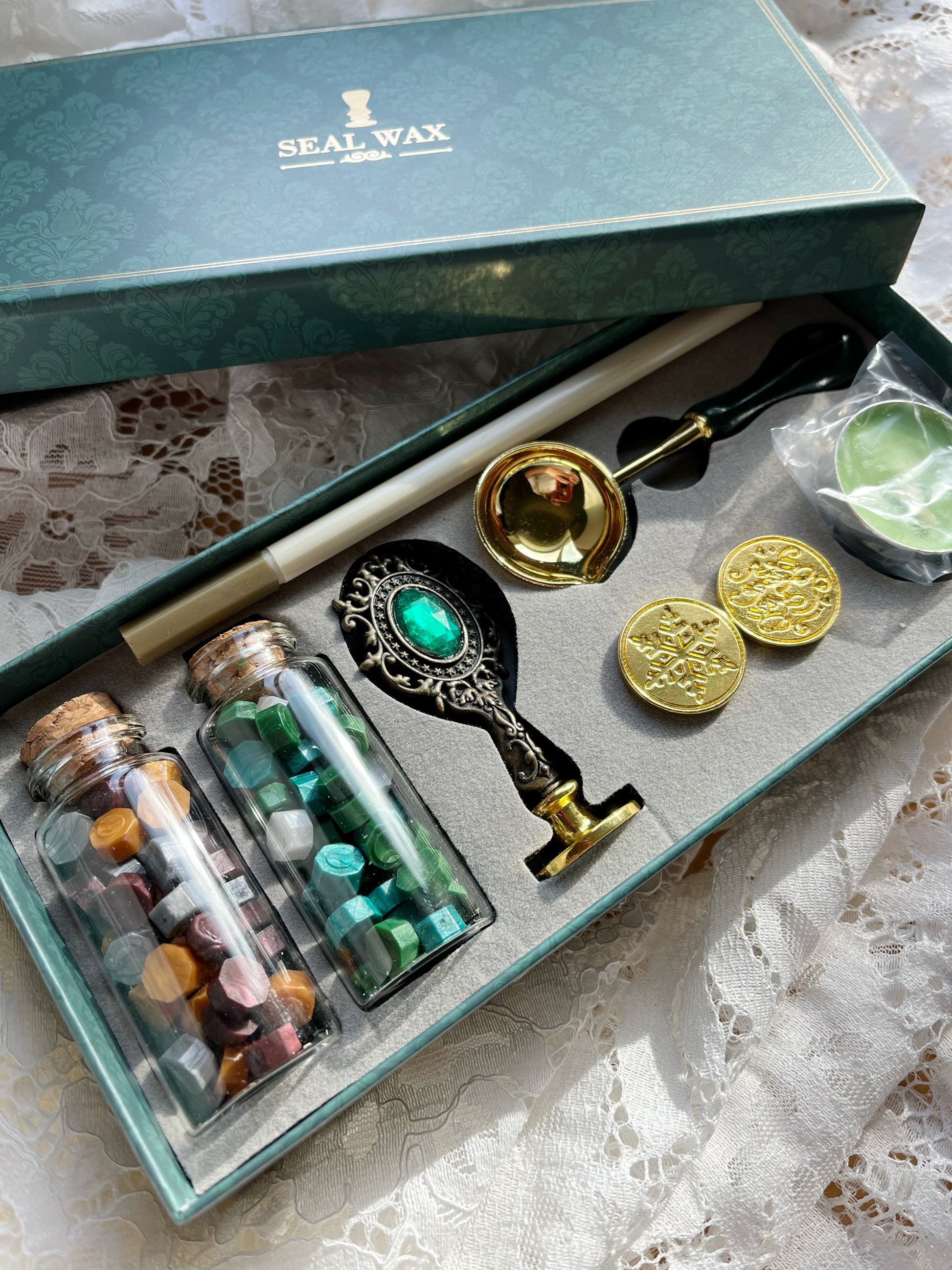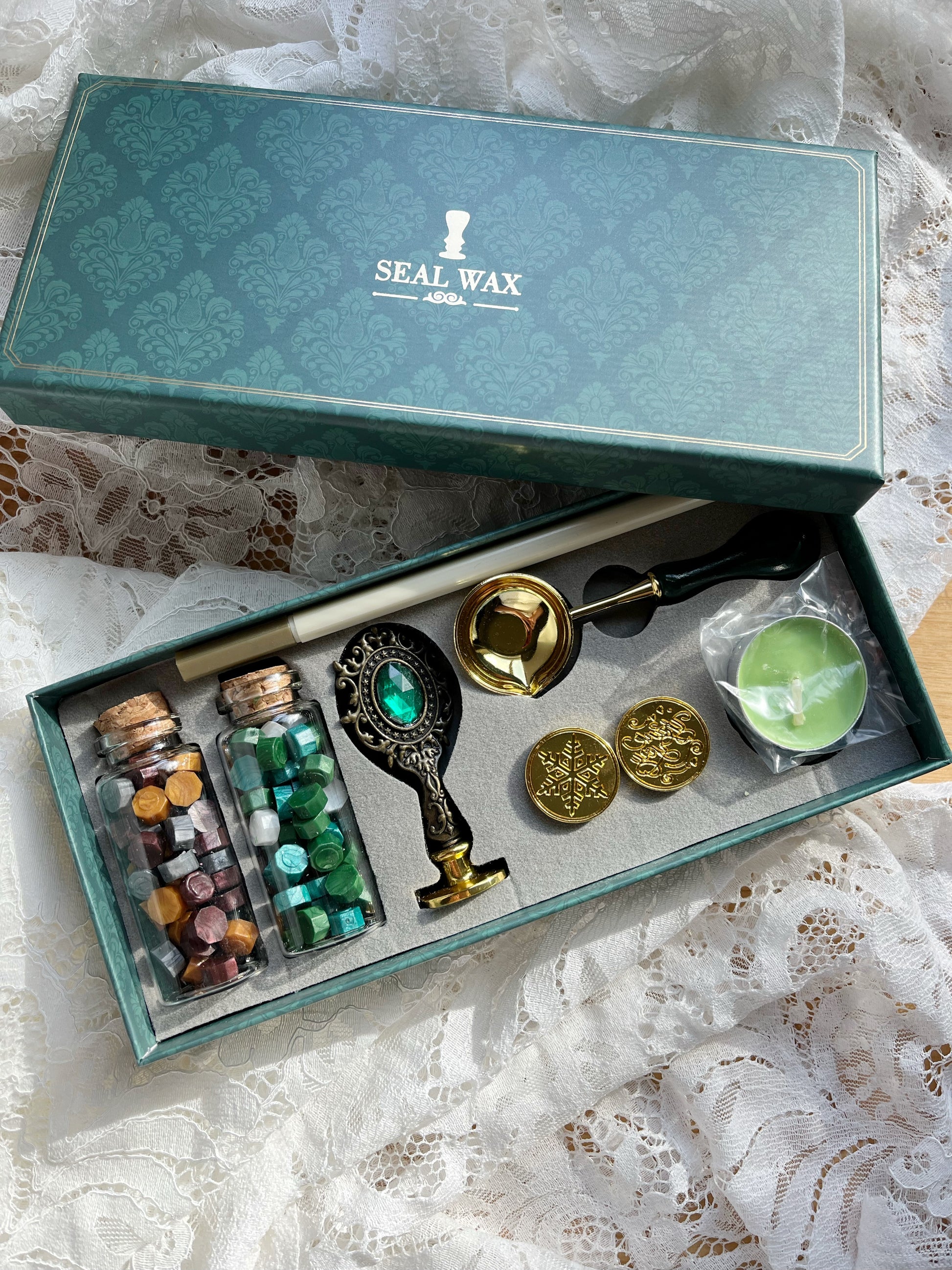 Includes: Gold pen, wax beads, stamp handle, three heads, spoon, and candle.
