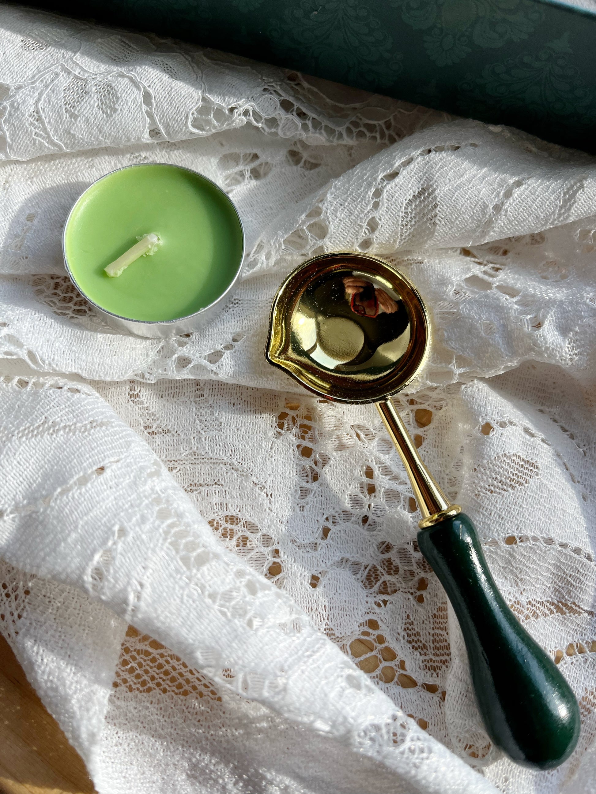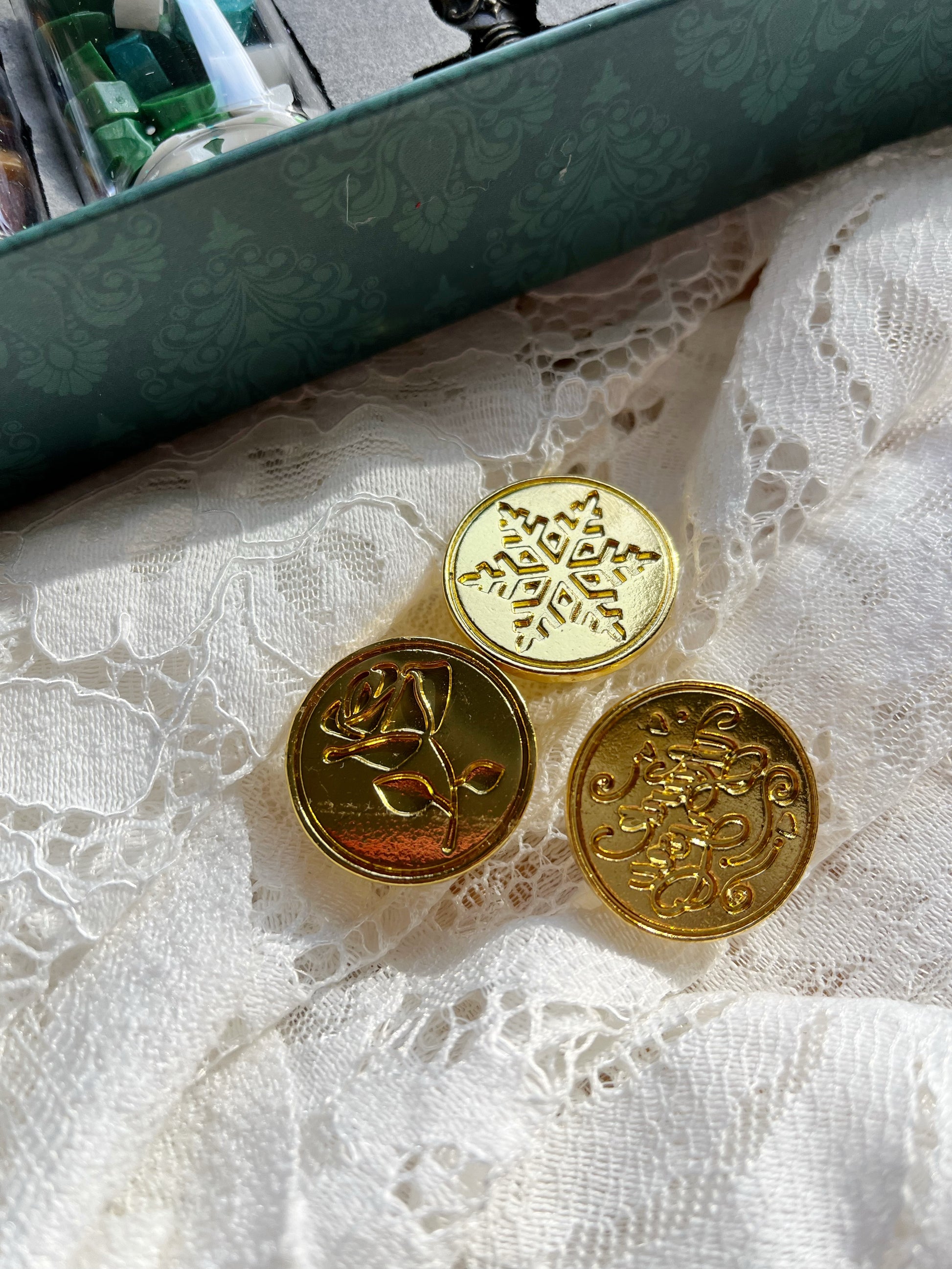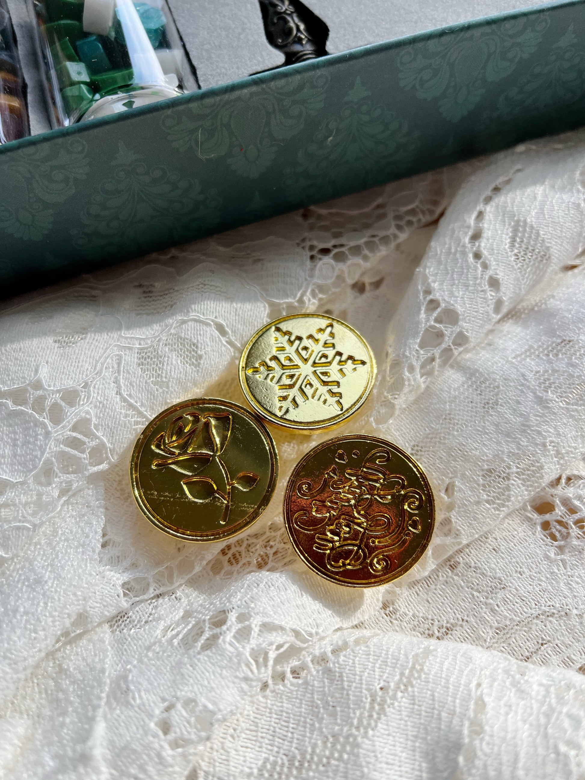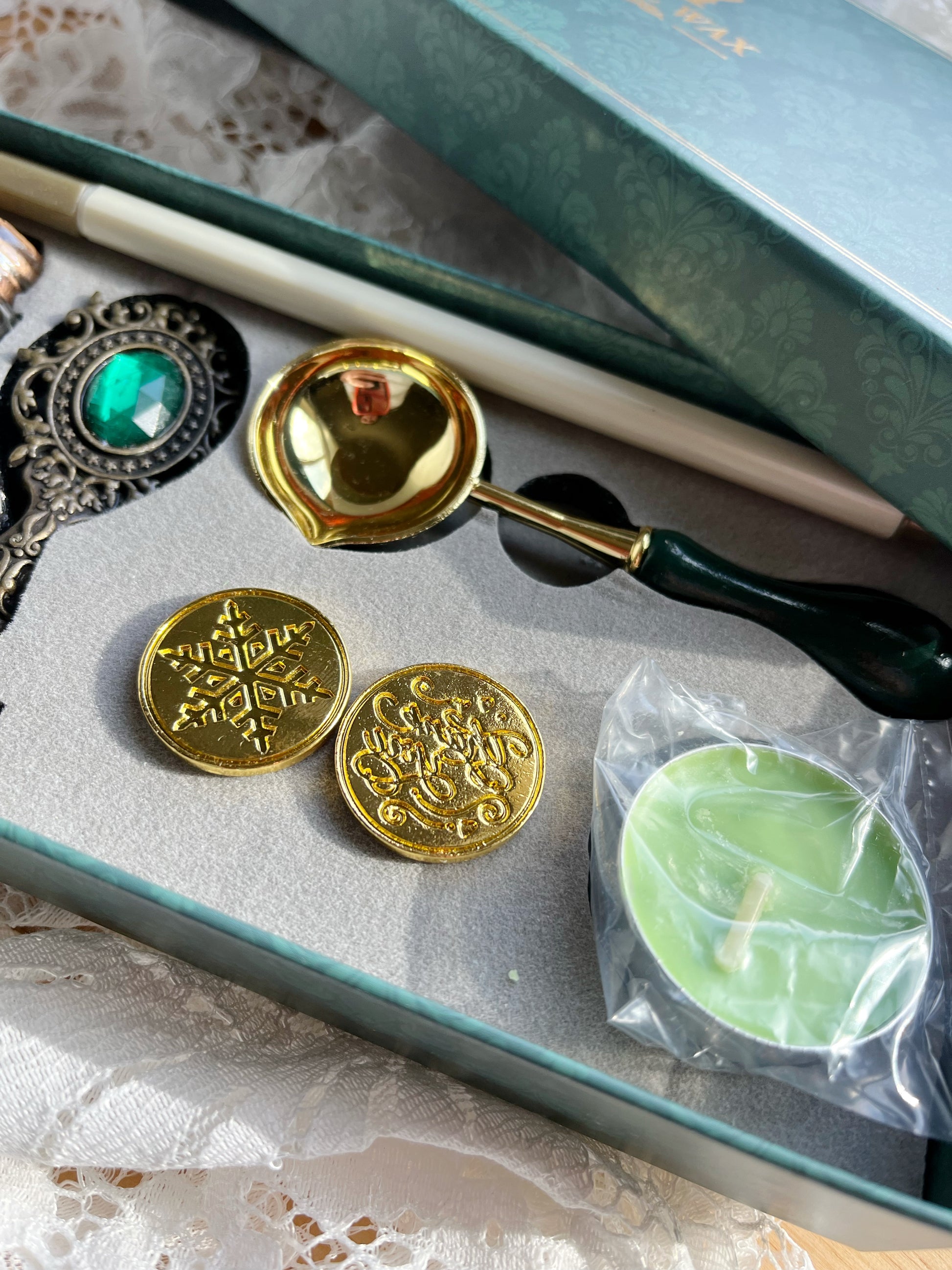 Includes: Gold pen, wax beads, stamp handle, three heads, spoon, and candle.